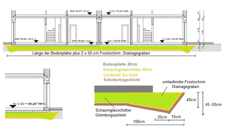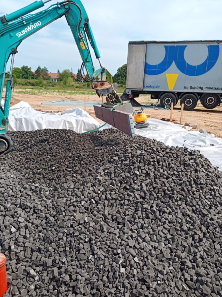 Der Schaumglasschotter wurde an einem Tag eingebaut und es konnten mind. 25% der üblichen Kosten eingespart werden.